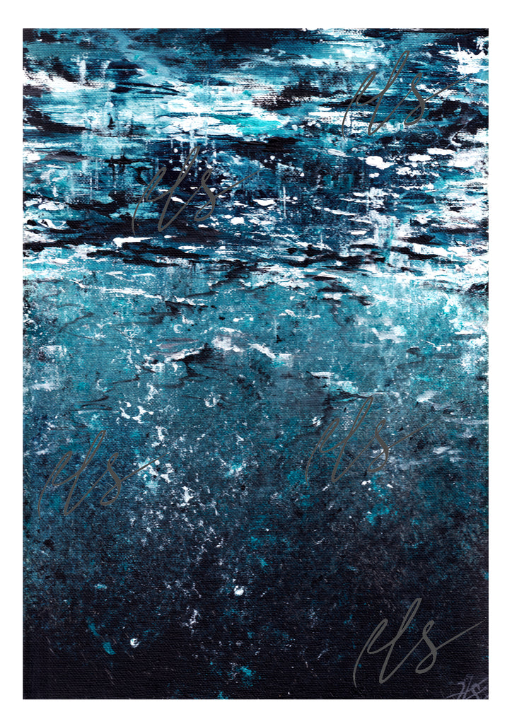 Abstract ocean art print, shine from under is an art print that depicts under water looking up at the surface below the sea, this art print is abstract and focuses on vivid cool tones and deep shades to create depth. Feeling submerged in the deep sea. This art print has a deep colouration of vivid greens and blues paired with crisp white highlights. This print really focuses on the texture of the palette knife work on the canvas.
